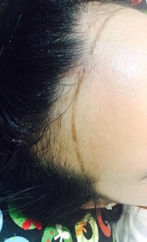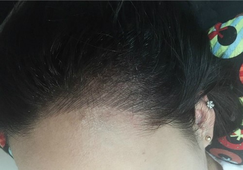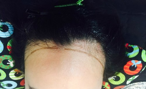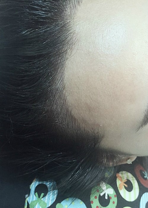 왼쪽 헤어라인반영구 시술 전 확대사진입니다. 오른쪽과 동일하게 머릿결을 따라 한올한올