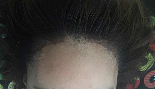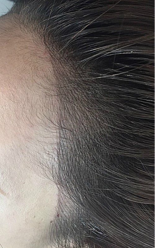 왼쪽 시술 전 확대사진입니다. 오른쪽과 동일하게 헤어라인문신 시술을 진행하였습니다.